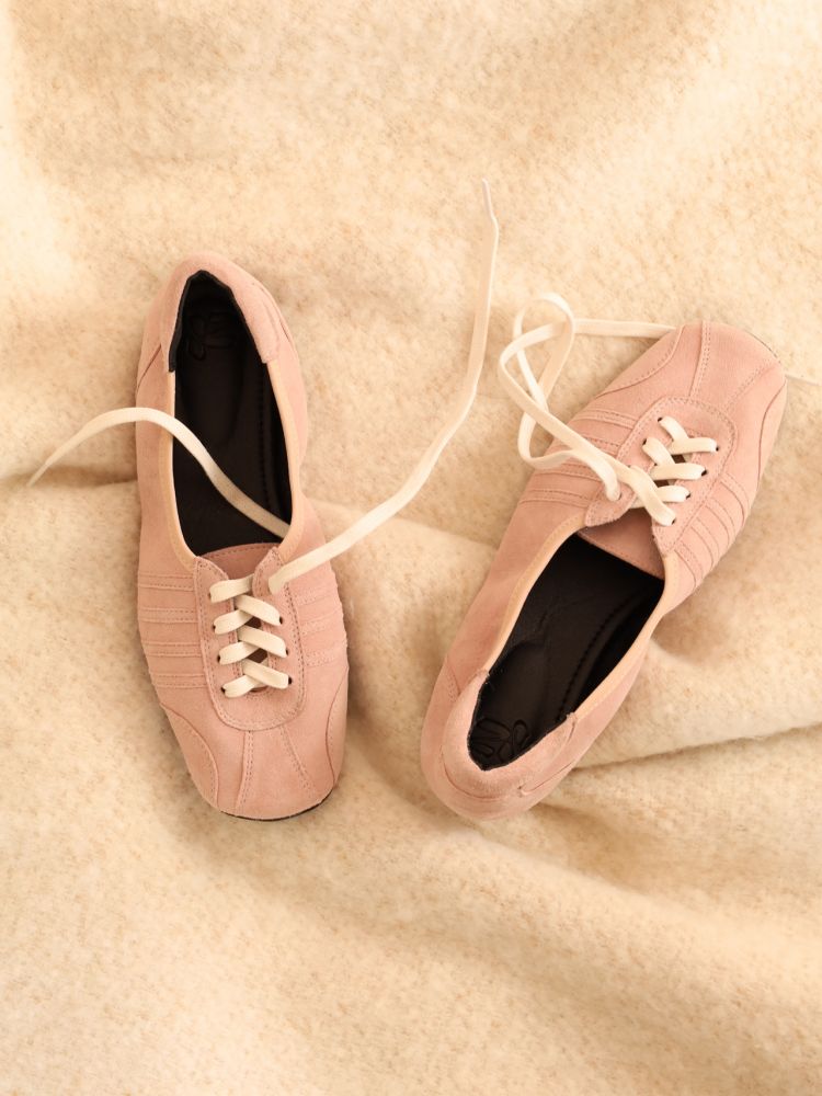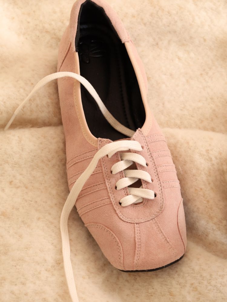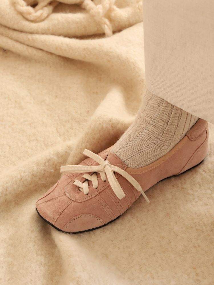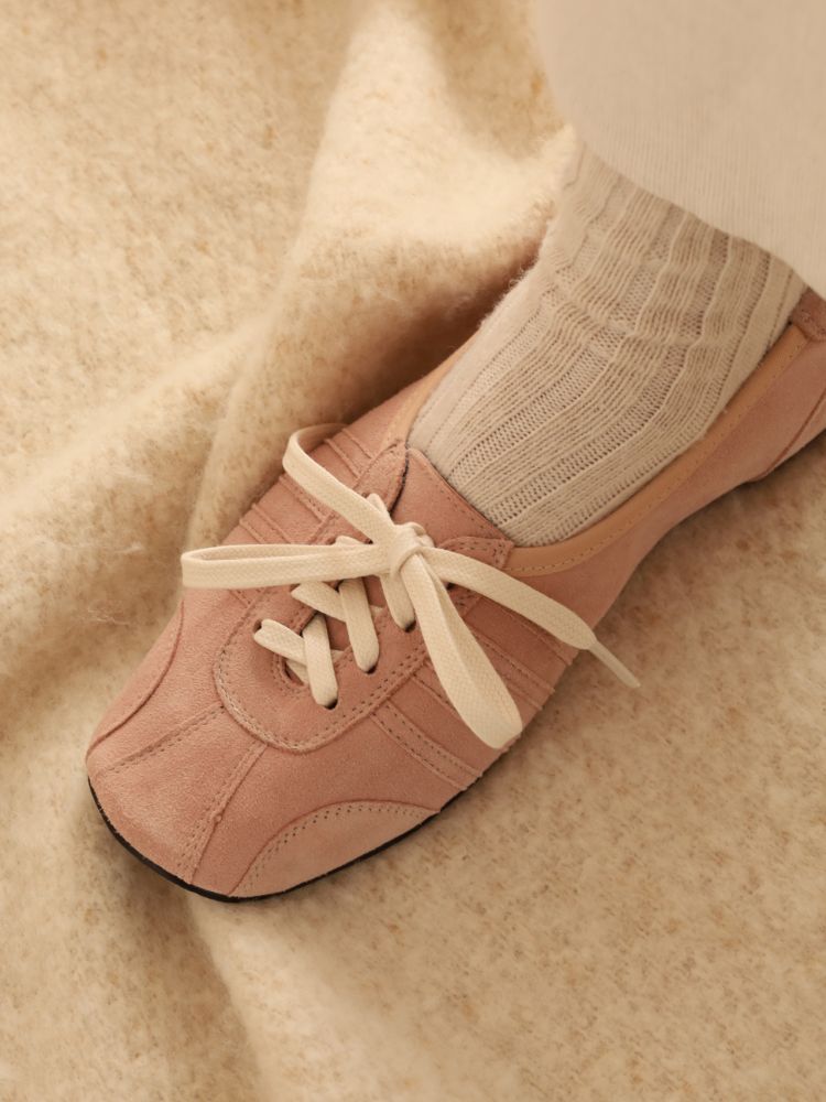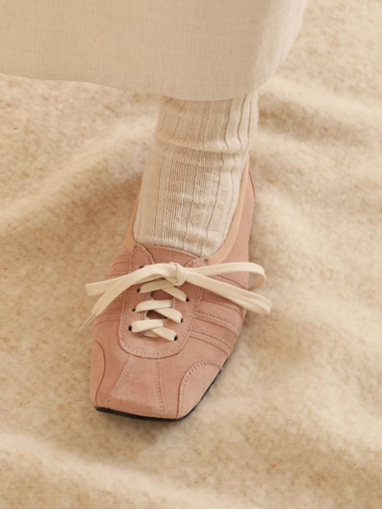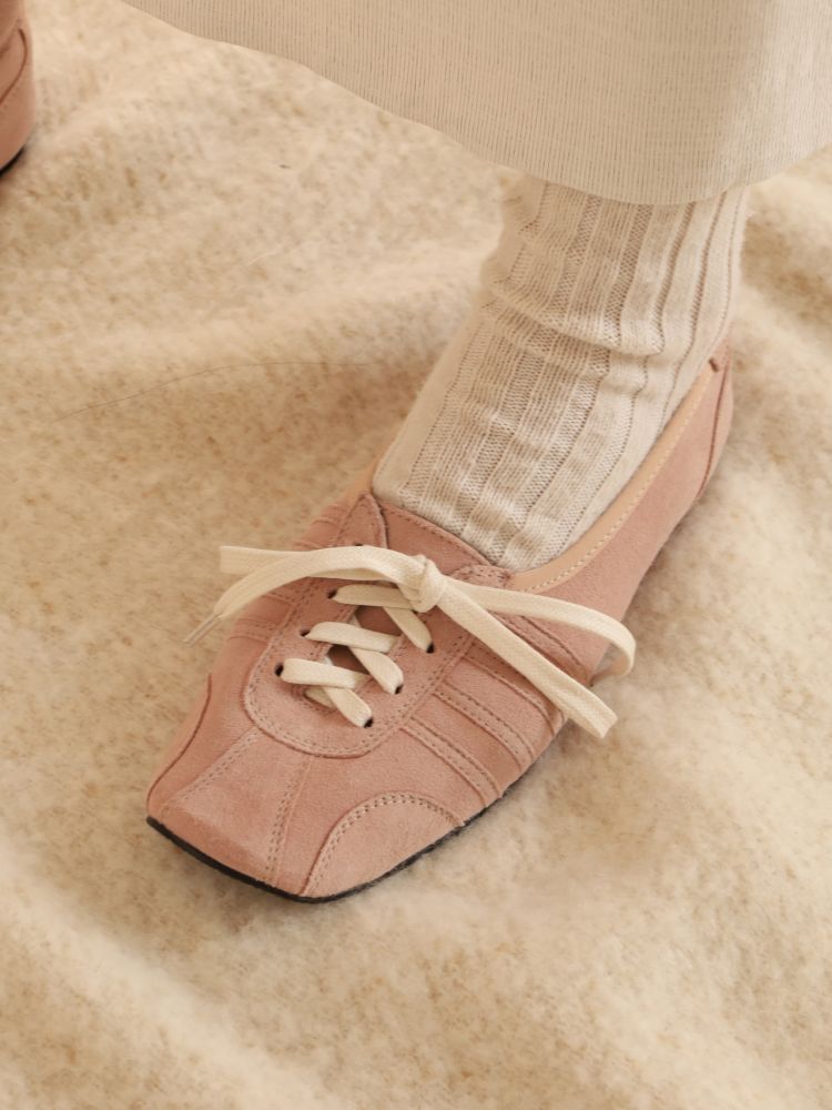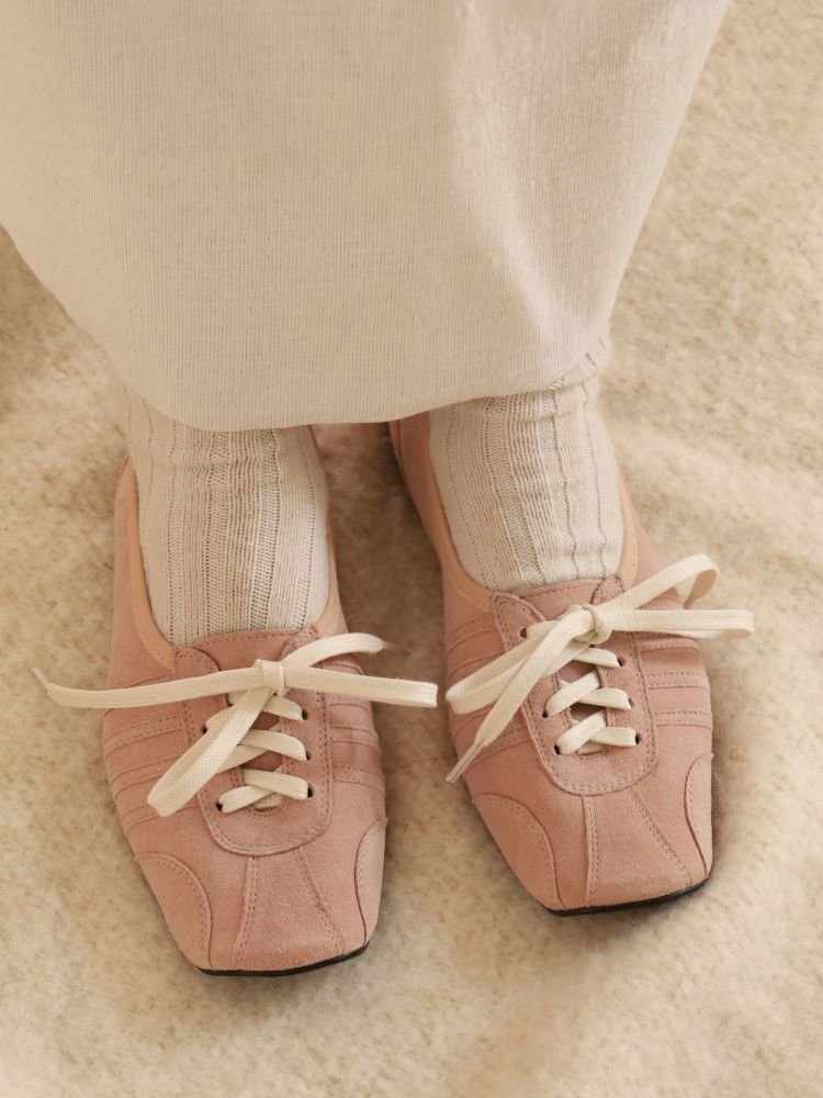 빈티지 발레화를 베이스로 트레킹, 축구, 복싱화의 디테일을 혼합한 디자인의 플랫슈즈입니다. 부드러운 질감을 가진 고트 스웨이드로 고급스러우며 동시에 독특한 분위기를 가지고 있습니다.